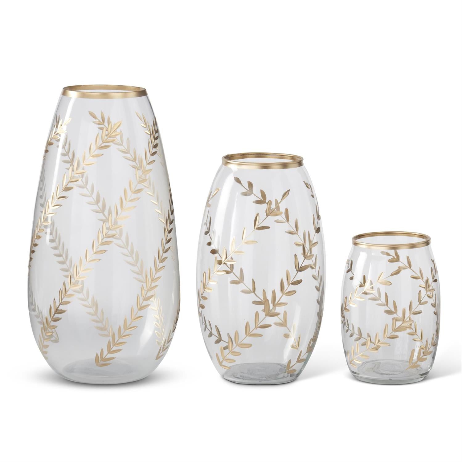 Medium Gold Gilded Leaf Etched Clear Glass Vase