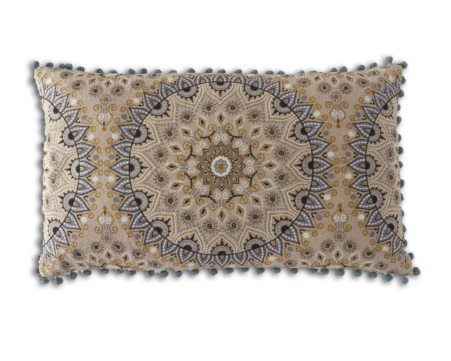 Blue & Cream Embroidered Mandala Pillow with Pom Pom