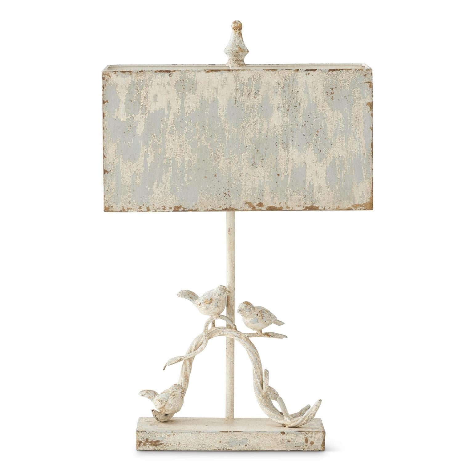 27 Inch Whitewashed Metal Birds Lamp w/Light Blue Re